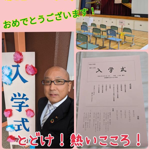4月4日(木曜日)本日は、四條畷市立忍ケ丘小学校 入学式に出席させて頂きました。とても可愛らしい皆さんで、自然に笑顔になれました!校長先生のお話中もちゃんとしていて、とても素晴らしい新1年生でした。2年生のお祝いの言葉のビデオメッセージもとても心温まる姿を見ることが出来ました。子ども達の為にも、より良い四條畷市にしてまいります!とどけ!熱いこころ!