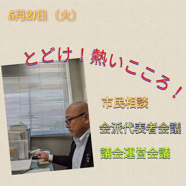 5月21日(火曜日)お疲れ様です。本日は、午前中は登庁致しまして、会派代表者会議、議会運営会議に出席し、議案や今後の議会運営について、議論を重ねより良い方向への会議となりました。午後からは、市民の皆様から寄せられたご相談を担当課へ。その後は、市民相談の訪問に。とどけ!熱いこころ!