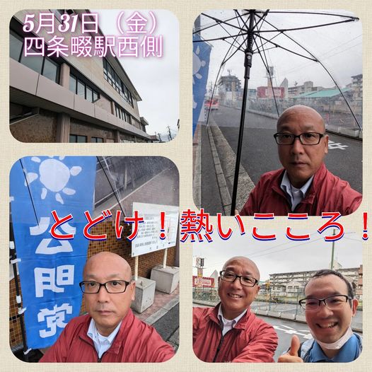 5月31日(金曜日)おはようございます!今朝は、四条畷駅西側にてご挨拶させて頂きました。雨がポッポッと降っていました。本日もたくさんの方とご挨拶できました。いつもいつもありがとうございます!その後、登庁しまして、会派代表者会議、議会運営会議、市民相談へと本日も頑張ってまいります!とどけ!熱いこころ!