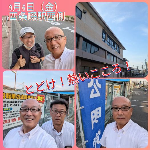 9月6日(金曜日)おはようございます!今朝は、四条畷駅西側にてご挨拶させて頂きました。暑さも朝夕は過ごしやすくなったように感じますね。まだまだ暑いですが、、、たくさんの方とご挨拶できました。お声掛けして頂き、ありがとうございました!久々に会った友人と近況報告、またいつものメンバーともご挨拶のパシャ!本日もこの後、地域のご挨拶訪問をさせていただきます!