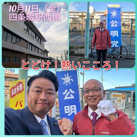 10月11日(金曜日)おはようございます!今朝は、四条畷駅西側にてご挨拶させて頂きました。随分涼しい朝でしたね。たくさんの方とご挨拶できました。いつもいつもありがとうございます!駅では、大東市#あずま健太郎 議員とご一緒になりました!本日は、水道企業団視察にお誘い頂いたので午後から、行ってまいります。