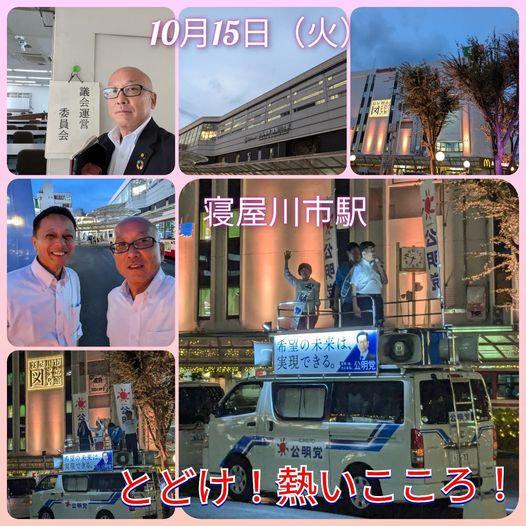その後は党本部へ、夕方からは、寝屋川市駅での公明党街頭演説会に役員として、参加致しました。