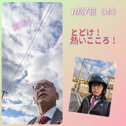 11月7日(木曜日)本日は、朝から登庁して、関係部局へ相談へ、また以前要望していた市民相談の進捗状況を確認して、相談者へご報告。そして、地域や企業様へご挨拶へありがとうございました!とどけ!熱いこころ!