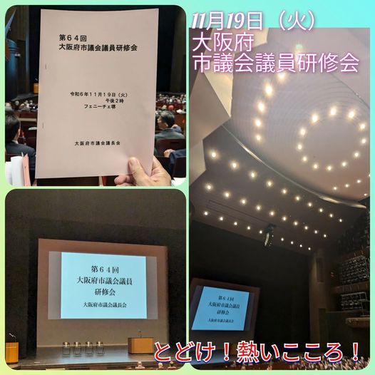 11月19日(火曜日)お疲れ様です。本日は、堺市のフェニーチェ堺にて開催された、大阪府市議会議員研修会に参加させて頂きました。講師は、「NEWS ZERO」メインキャスターを務められた、村尾信尚 氏です。「私のチャレンジ〜これまでも、これからも挑戦〜」という演題です。学びの大きな講演となりました。しっかりとこれからの活動に活かせてまいります!とどけ!熱いこころ!