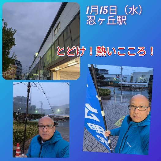 今朝は、忍ヶ丘駅西側からご挨拶をさせて頂きました。冷たい小雨が降る寒い朝でした。