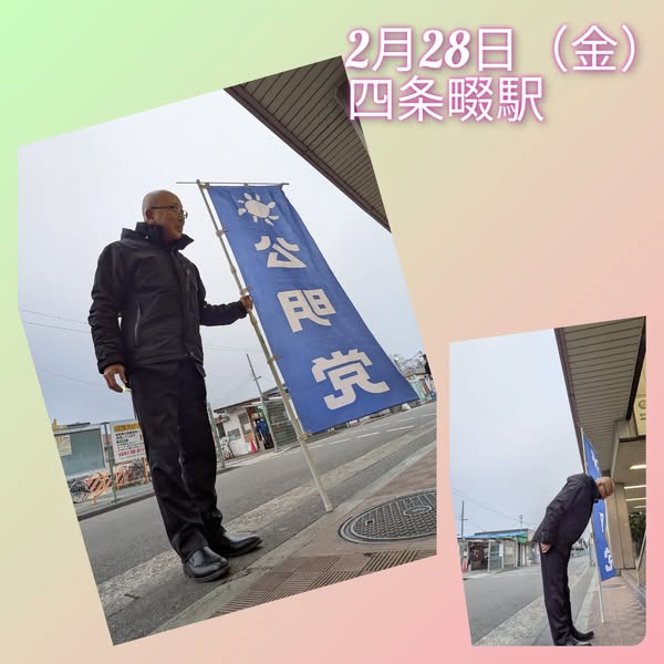 2月28日(金曜日)おはようございます!今朝は、四条畷駅西側にてご挨拶させて頂きました。寒さは和らぎましたね。しかし、お天気が良くないよう雨がパラパラと、、、ご挨拶いつもいつもありがとうございます!春が待ち遠しいです!!