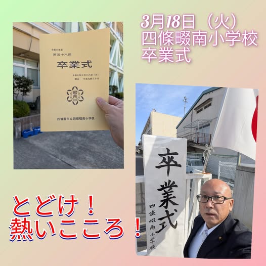 3月18日(火曜日)本日は、市内小学校の卒業式が晴天のもと開催されました。私は我が母校である、市立四條畷南小学校の卒業式にいかせていただきました。校長先生がとても思いやりのある生徒なんですと教えてくれました。卒業生はひとクラスで少ないですが、最後に歌ってもらった歌声が響きわたり、とても素敵した。感動しました!その後は市役所に戻り、会派代表者会議と議会運営委員会に出席しました。とどけ!熱いこころ!