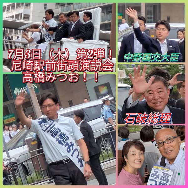 7月3日(木曜日)第2弾!!寝屋川市駅ロータリーでの #杉ひさたけ 参議院候補の街頭演説会終了後、兵庫へJR尼崎駅ロータリーでの #高橋みつお 参議院候補の街頭演説会に参加しました。中野ひろまさ 国土交通省大臣石破茂 総理大臣も演説会に来られてました。尼崎、塚口へ電車と徒歩でご挨拶へしっかりとお願いができました。週末も兵庫へ丹波市、西宮市へ大勝利に向けて、頑張ります!