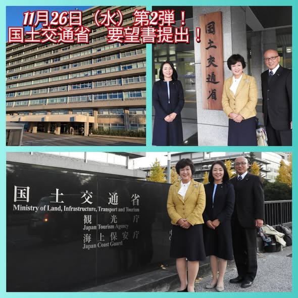 11月26日(水曜日)第2弾!!本日は、忍ヶ丘駅前の朝のご挨拶あと、登庁しまして事務局へ。その後は、四條畷市の陳情のため、四條畷市議団とうつみ久子府議と上京。銭谷市長、担当課部長とともに国土交通省へ、市の大切な道路整備の予算要望のために、公明党府本部石川代表に入っていただき、「四條畷市道路事業に係る 社会資本整備総合交付金要望書」を提出。 大きな予算を必要とする道路整備、またバリアフリー化に伴う整備事業の予算要望を行いました。とどけ!熱いこころ!