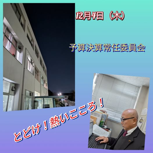 12月4日(木曜日)お疲れ様です。本日は、朝から登庁しまして、予算決算常任委員会が開かれ、令和7年度四條畷市一般会計補正予算第6号を審議いたしました。これで各常任委員会が終了いたしました!議会一般質問に取り組みます!寒さがましてます!インフルエンザ、コロナも流行しておりますので、お身体にはご留意ください。とどけ!熱いこころ!