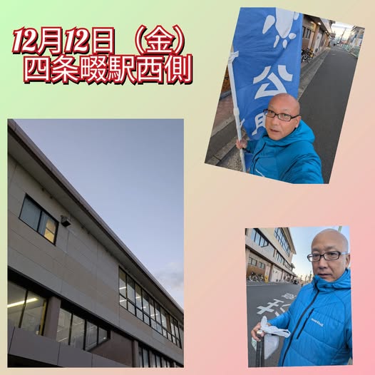12月12日(金曜日)今朝は、四条畷駅西側にてご挨拶させて頂きました。風が強いくて、寒い寒い朝でしたね。皆さんから「風邪ひかないようにね」「寒い中ご苦労さま」などなど、激励をいただきました。そのお声に心があったかくなりました。皆様に感謝です😭朝から登庁しまして、事務局へ 市民相談を担当課へ相談と、以前の要望の回答をいただきました。午後は市民相談、相談のご回答、議会準備などに動きます!!とどけ!熱いこころ!