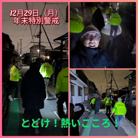 12月29日(月曜日)お疲れ様です。本日は、朝からご挨拶回りをさせていただきました。たくさんの激励とご相談もいただきました。そして夜は地元北出町の年末特別警戒をさせていただきました。連日の警戒、本当にありがとうございます!とどけ!熱いこころ!