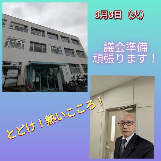 3月3日(火曜日)本日は、朝から登庁しまして、議会事務局へ、正副議長説明と打合せがありました。これから、代表質問、予算委員会、一般質問が続くので、議会前準備です!!頑張ります!とどけ!熱いこころ!