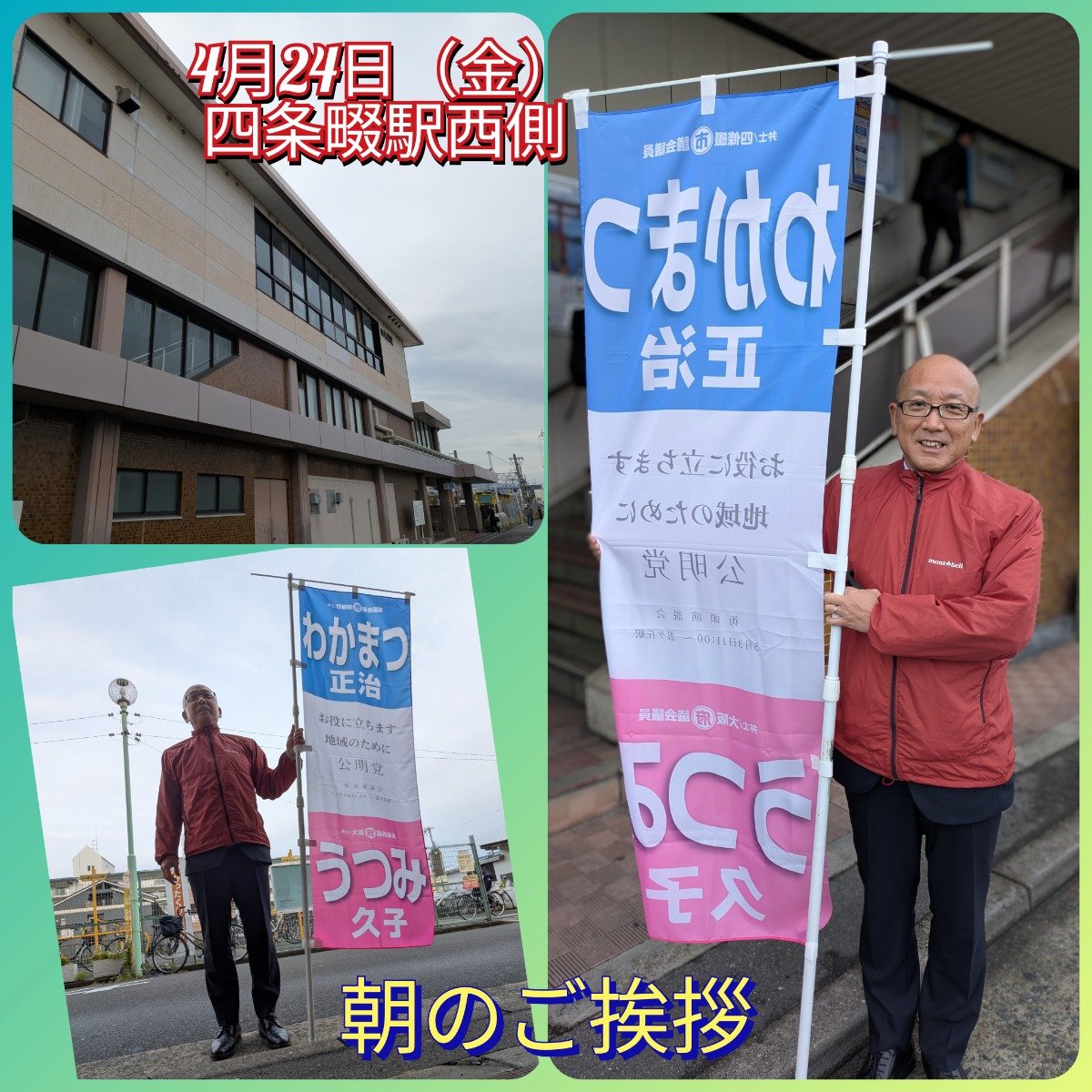 今朝は、四条畷駅西側より朝のご挨拶をさせていただきました。まだまだ朝は肌寒いですね。