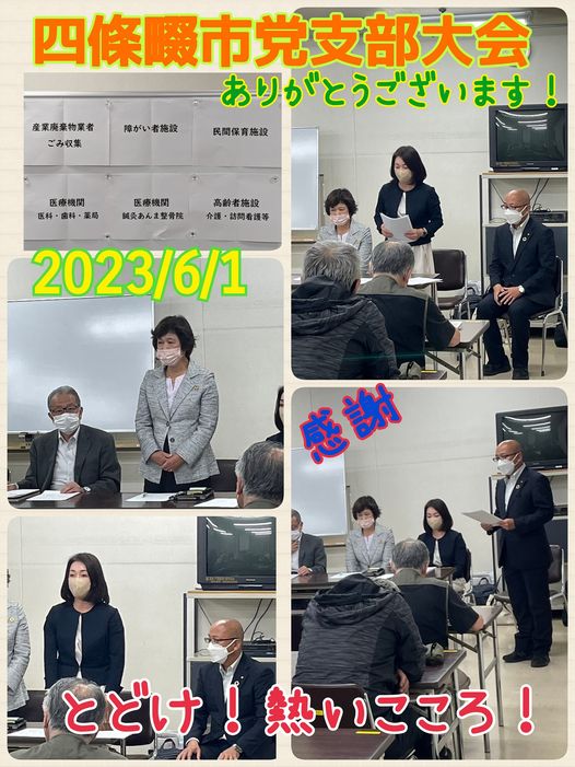 6月1日(木曜日)お疲れ様です。本日は登庁して、市民相談に動き、関係各所管へ相談。夜は、四條畷市党支部大会が開催されました。雨の中、たくさんの方にご出席して頂き、党人事、ご報告、質疑応答などを実施致しました。皆さまの日々のご支援に、心より感謝申し上げます。ありがとうございます!とどけ!熱いこころ!