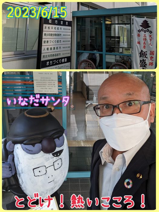 6月15日(木曜日)お疲れ様です!本日は登庁して、議会の準備と非破壊検査のお話を学ばせて頂きました。少しでもより良い街づくりに役立てる為。それからは市民相談!いなだサンタに見送られながら!とどけ!熱いこころ!