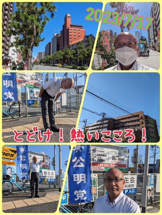 7月17日(月曜日)昨日は、大阪市内へ出ておりました。暑い1日でした。あと、地域の方へご用聞き訪問を致しました。そして今朝は、畷生会病院前にてご挨拶させて頂きました。暑い朝でした。本日も暑くなります、外出もお気をつけて!お昼からは四條畷市市民総合センターで行われます、日本伝統芸能 夏祭を見に行きます!とどけ!熱いこころ!