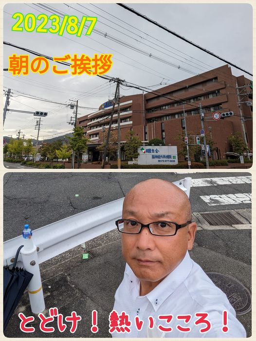8月7日(月曜日)おはようございます!今朝は、畷生会病院前にてご挨拶させて頂きました。朝から小雨ですが雨が降ってましたね。途中で、傘を差したり閉じたり。1日こんな感じだそうです。それでも水分補給してお過ごしください。とどけ!熱いこころ!