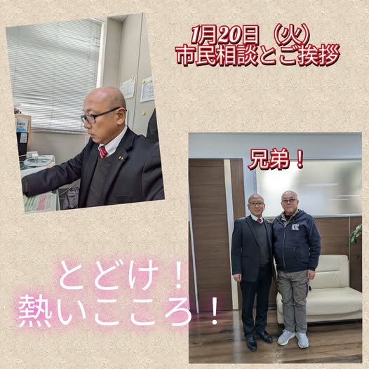 1月20日(火曜日)本日は、朝から登庁しまして、事務局に意見交換会や要望について、まとめ要望に動きました。午後からは市民相談と、年賀会の御礼にご挨拶させていただきました。とどけ!熱いこころ!