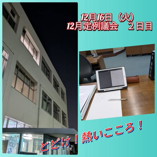 12月16日(火曜日)朝から登庁しまして、12月定例議会が開会2日目となりました。議案、追加案件や、付託となった予算決算常任委員会、議会全員協議会、議会だより委員会と続き、延刻しそれから一般質問へ。た…